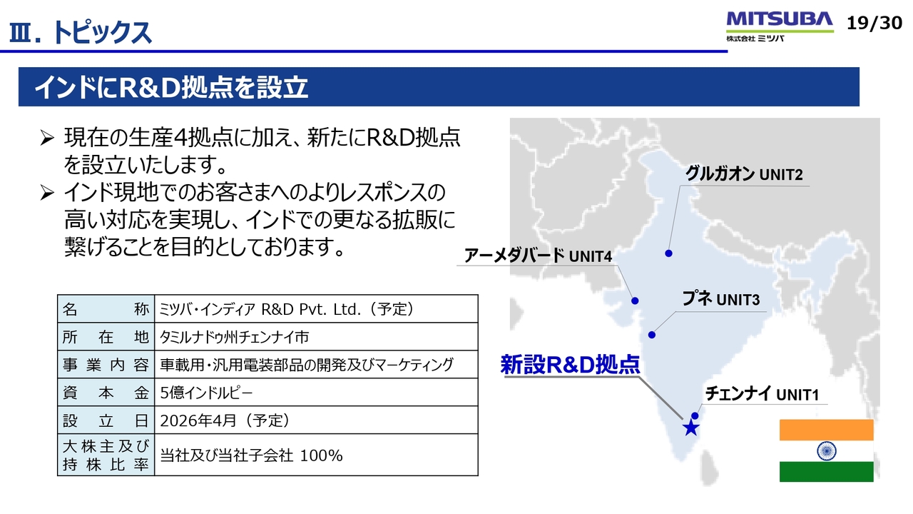 さらに、単なる生産体制の増強だけでなく、R&Dを行う会社を設立することも今回リリースしています。本社をチェンナイに設置し、サテライトをグルガオンに設置する計画を、併せて進めています。