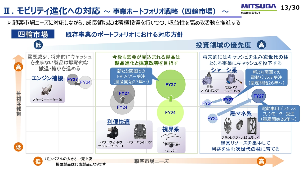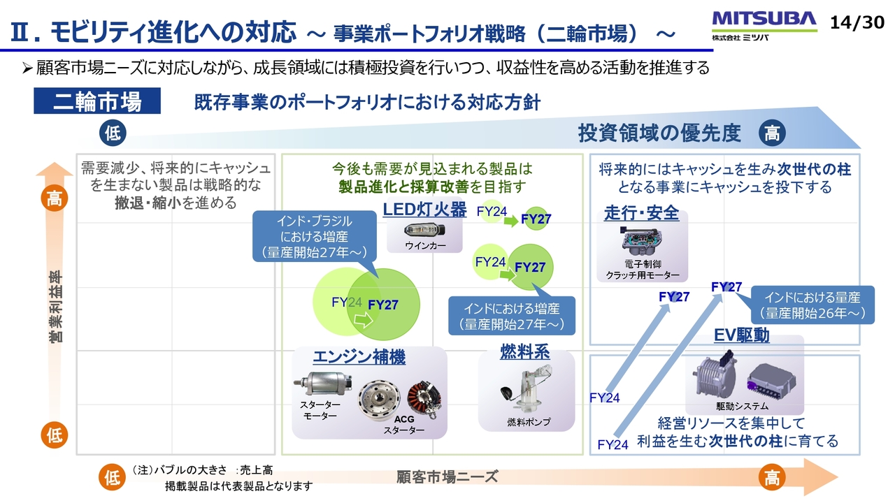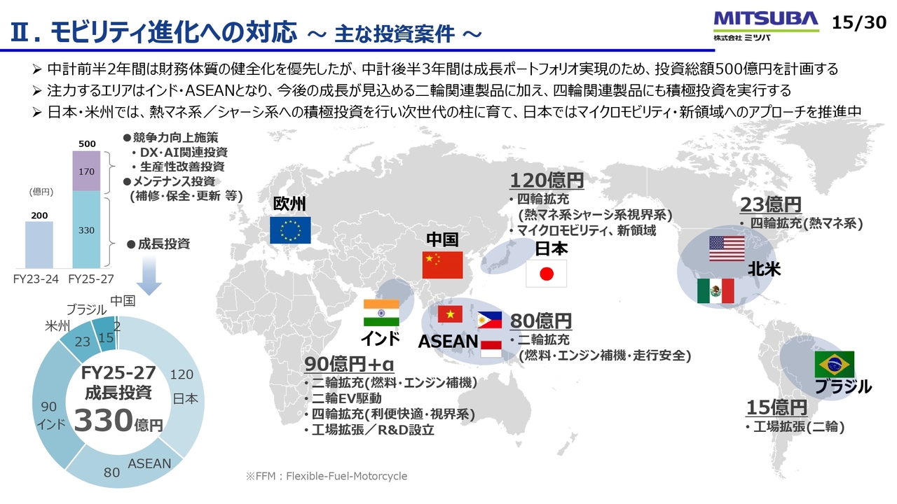 燃料系については、インドで2027年から大幅な増産を予定しています。また、エンジン補機系についてもインドやブラジルで同じく2027年から大幅な増産を計画しています。四輪、二輪とも、ポートフォリオの変革については、現時点では順調に推移している状況です。