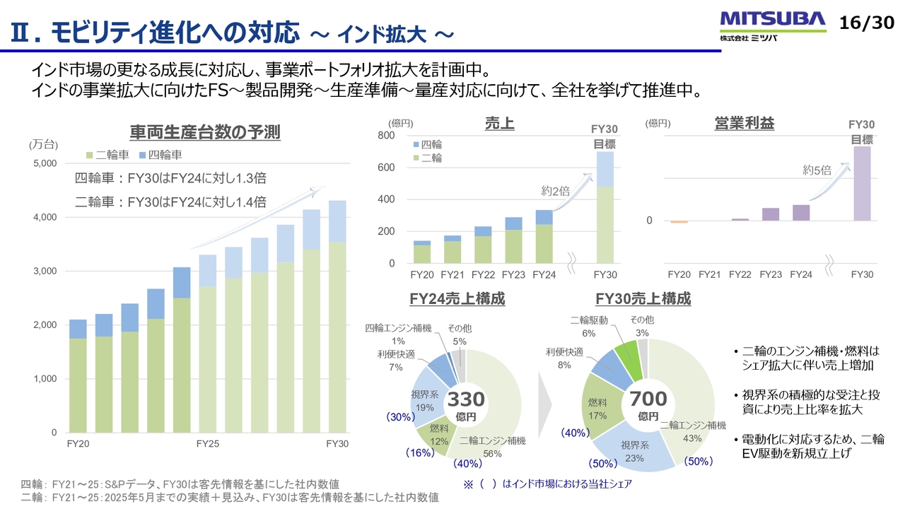 二輪については、二輪のエンジン補機の現在の市場シェアは40パーセントですが、FY30では50パーセントを目指しています。また、燃料系においては、現在のシェア16パーセントを40パーセントまで伸ばしたいと考えています。