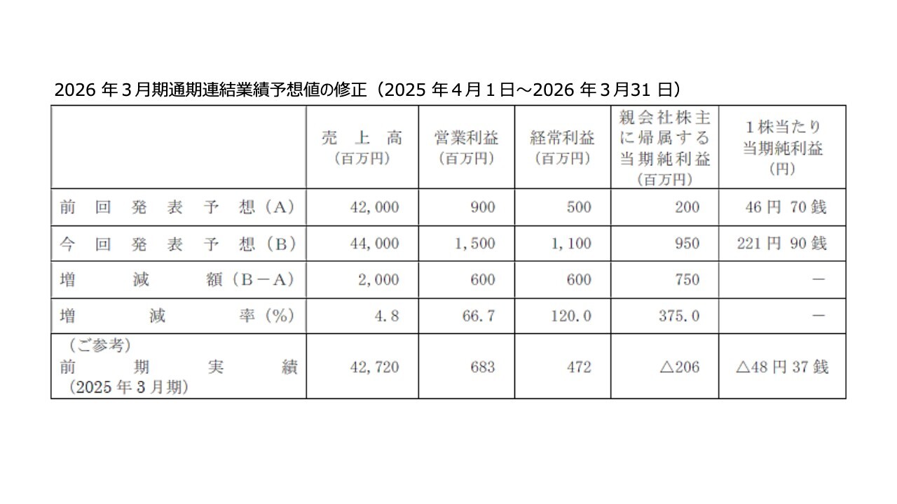 2026年3月期の業績予想については、直近予想を上方修正し、売上高440億円、営業利益15億円、経常利益11億円、当期純利益9億5,000万円とします。