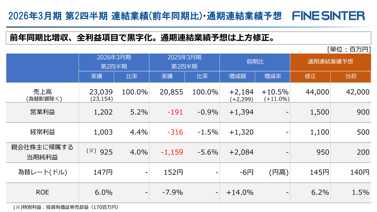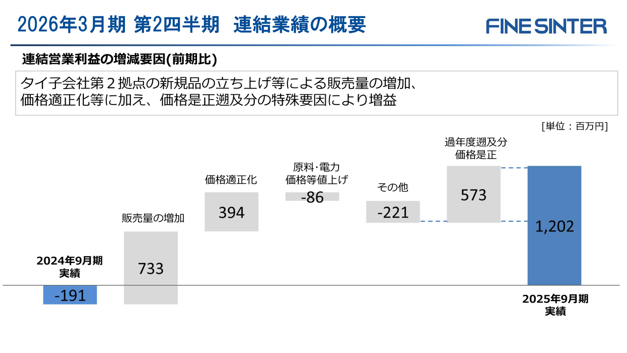 営業利益を前年同期と比べますと、販売量の増加による約7億円の増益効果の一方、原料・エネルギー価格変動・労務費ベースアップ・米国関税等8,600万円のコストアップがありましたが、販売価格への転嫁や不採算品の価格是正で3億9,400万円を計上し、さらに過年度における原材料単価変動に関する調整による特殊要因5億7,300万円があり、前年同期に比べ、13億9,400万円増益の12億200万円となりました。なお、この特殊要因がなかった場合、当第2四半期営業利益は6億円強の実力であったと認識しています。