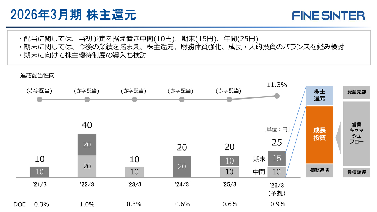 当面のキャッシュアロケーションとしては、来年量産化を予定しているリアクトルアッシーなどの成長投資や財務体質改善を優先に考えています。期末配当については、今後の業績、財務基盤強化・将来への成長投資・人的資本投資と株主還元のバランスを鑑みて検討していきます。また、株主優待制度の導入についても検討しており、確定しましたら別途公表します。