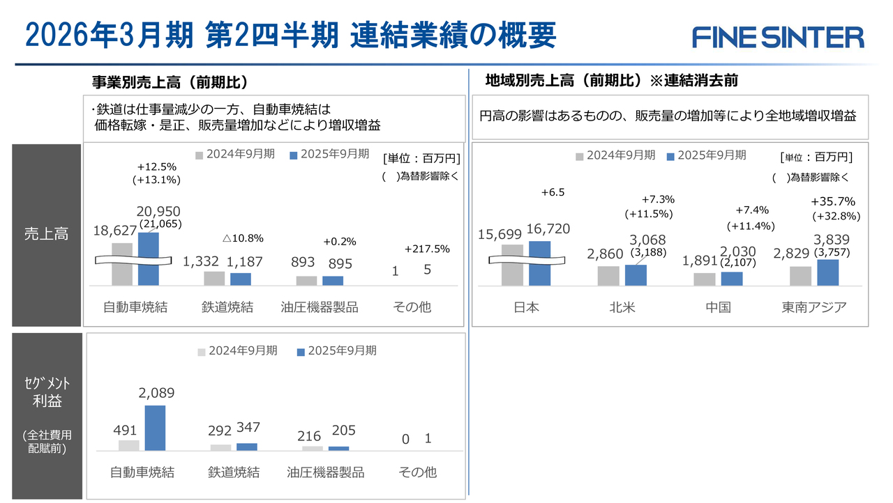 事業別にみますと、自動車焼結は、昨年立ち上げたタイ第2拠点やハイブリッド車用インバーター部品の新規ラインの寄与など、販売量の増加で12.5パーセントの増収となりました。