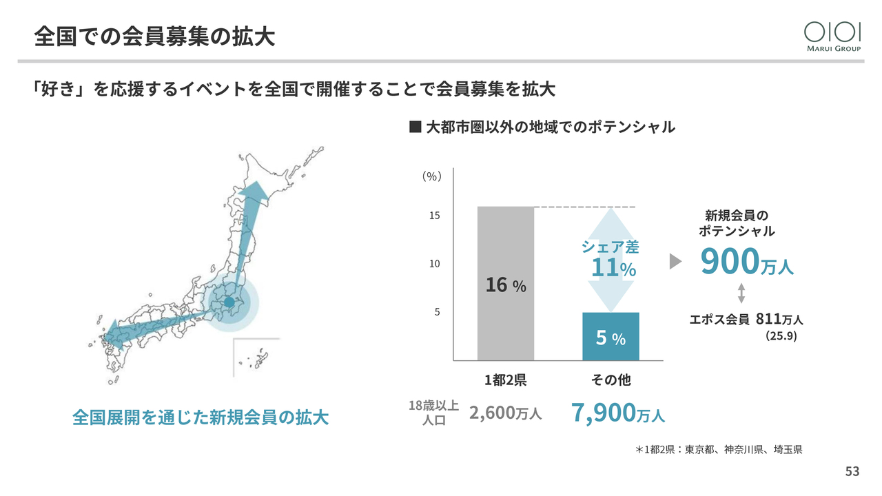「エポスカード」のシェアは、マルイの店舗が集中する1都2県では16パーセントですが、それ以外の地域では5パーセントにとどまっています。このシェアを1都2県並みに高めることで、新規会員のポテンシャルは900万人となり、現状の会員数811万人を上回る規模となります。