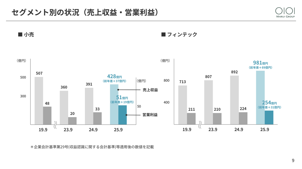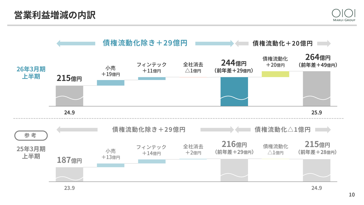 連結営業利益は23パーセント増の264億円、債権流動化の前年差影響を除く実質営業利益でも14パーセント増の244億円で、29億円の増益となりました。セグメント別では、小売が19億円増益し、コロナ禍前の水準を上回る51億円、フィンテックは31億円増益し、上半期として過去最高の254億円となりました。