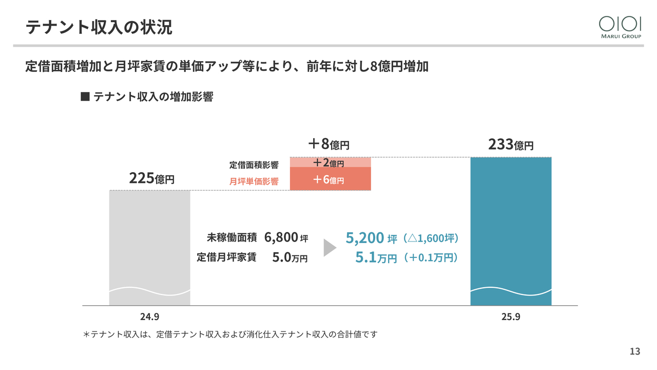 テナント収入の増加要因です。未稼働面積の減少と月坪家賃単価の上昇などにより、テナント収入は8億円増加しました。