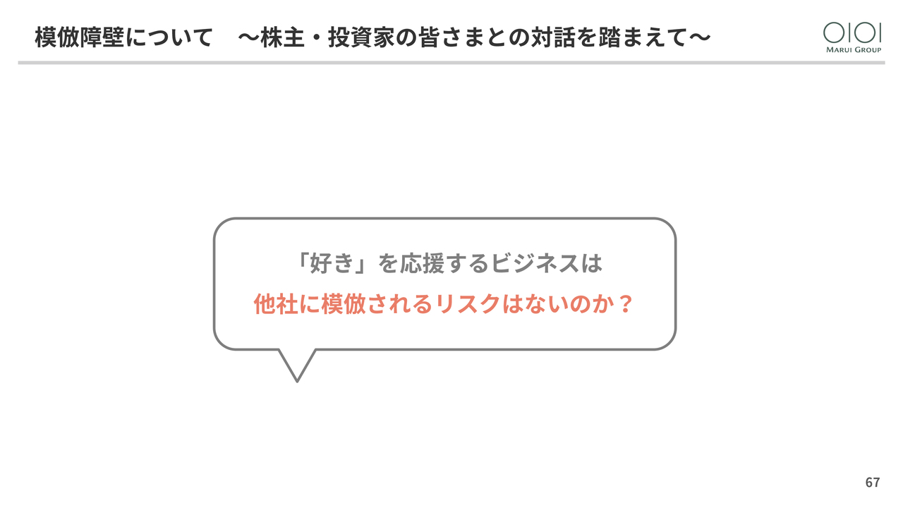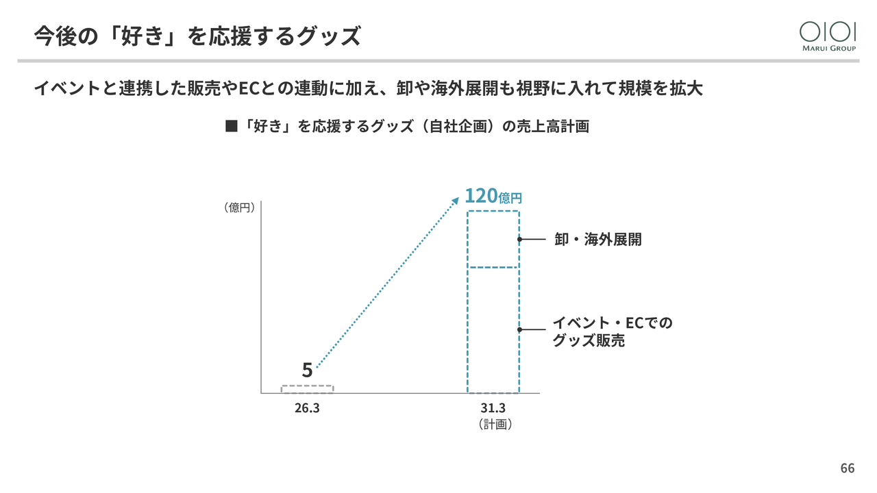 質問者:66ページ目についてうかがいます。「好き」を応援するグッズの卸および海外展開について記載されていますが、相対的に小さく見えるため、大規模に展開されるわけではないのかもしれません。そこで、特に海外で販売されるという点について、どのようなイメージをお持ちなのかをお聞かせください。