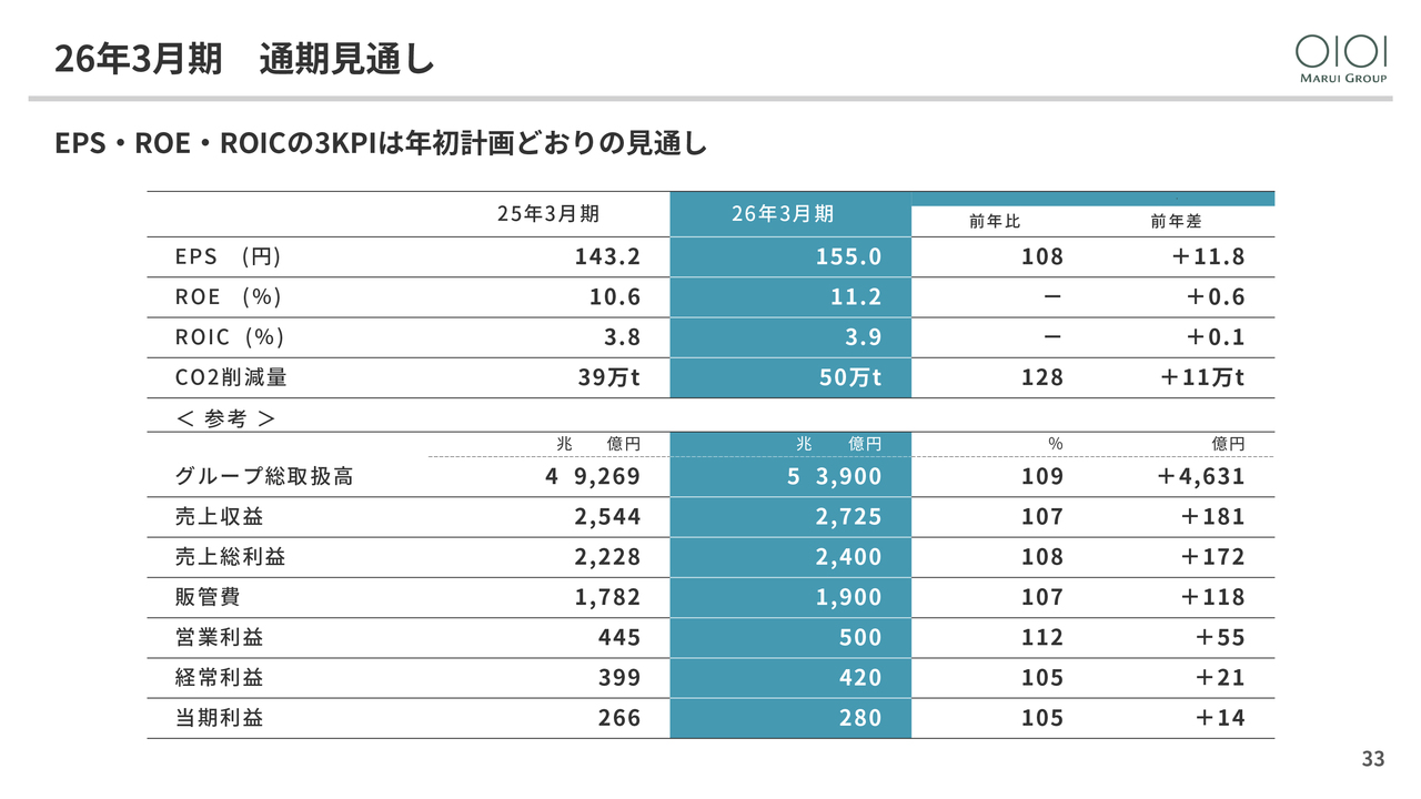 2026年3月期の通期見通しです。EPS・ROE・ROICの3つのKPIは年初計画どおりの達成を見込んでおり、営業利益は12パーセント増の500億円、当期利益は5パーセント増の280億円と、いずれも年初計画から変更はありません。