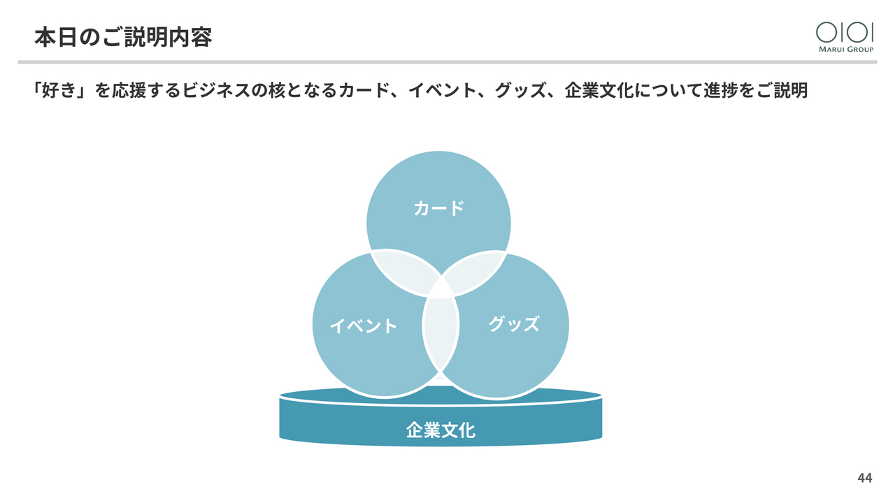 「好き」を応援するビジネスは、「『好き』を応援するカード」、イベント、グッズを中心に展開しています。本日は、これら3つのビジネスの進捗状況についてご説明します。また、それらの基盤となる企業文化についても併せてご説明したいと思います。