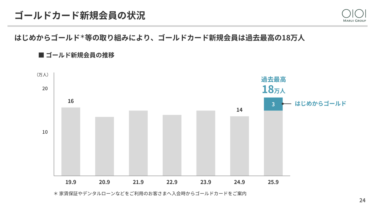 ゴールドカード新規入会の状況です。家賃保証などのサービスを利用されるお客さまに対し、入会時からゴールドカードをご案内する「はじめからゴールド」などの取り組みにより、上半期では過去最高の18万人となりました。今後の取扱高の拡大に寄与すると考えています。