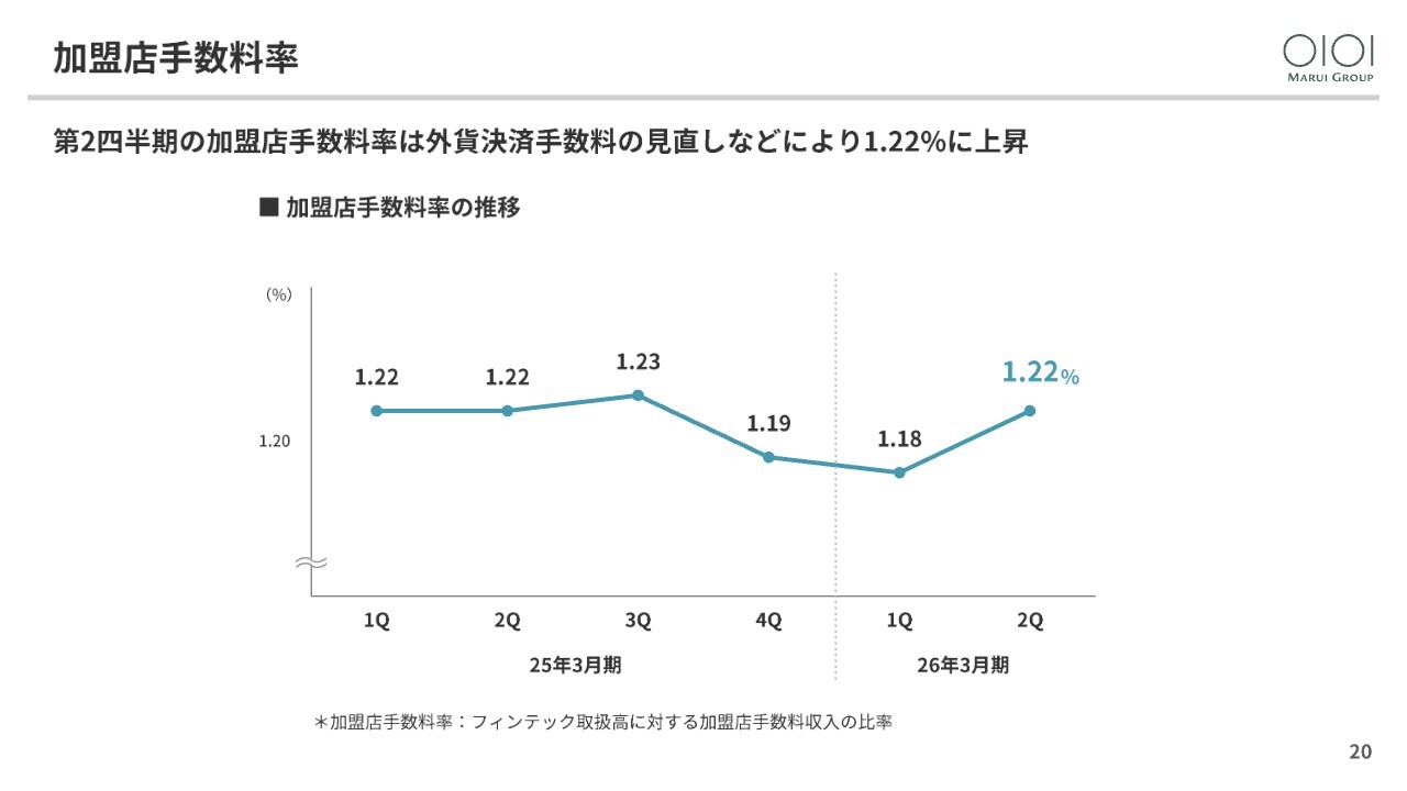 加盟店手数料率の推移です。第2四半期の加盟店手数料率は、2025年7月からの外貨決済手数料引き上げに伴い、1.22パーセントに上昇しました。