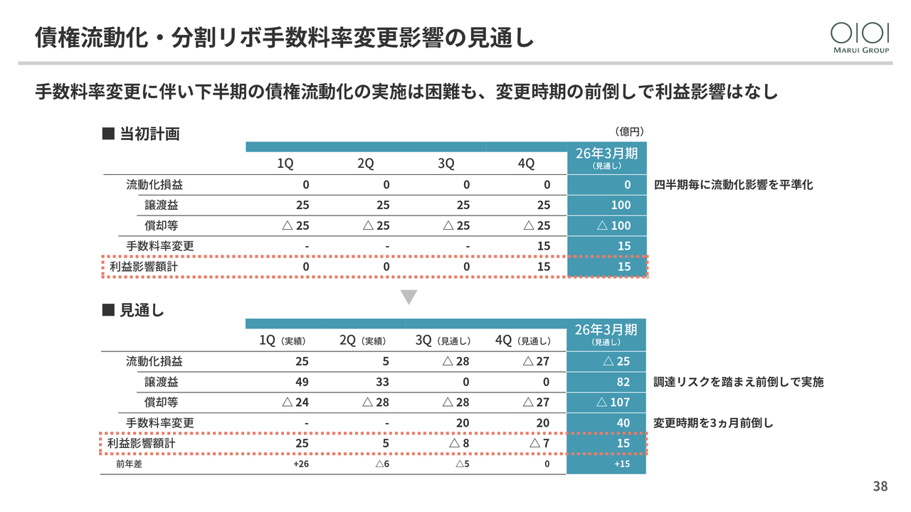 なお、債権流動化のマイナス影響と分割リボ手数料率の変更時期の前倒しによる四半期ごとの利益影響はスライドのとおりです。手数料率変更に伴い、下半期は債権流動化を実施しませんが、手数料率変更時期を年初計画より早めたため、利益への影響はありません。