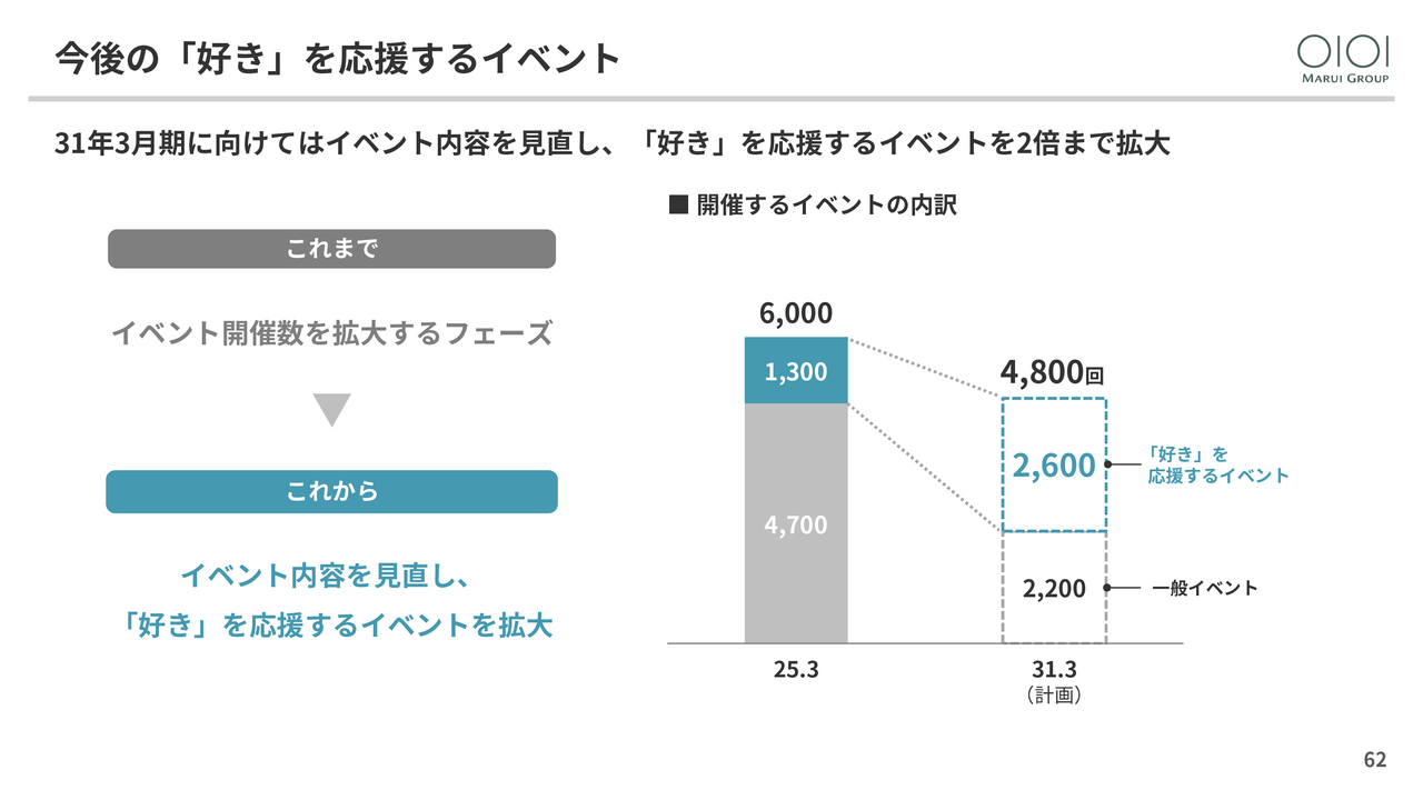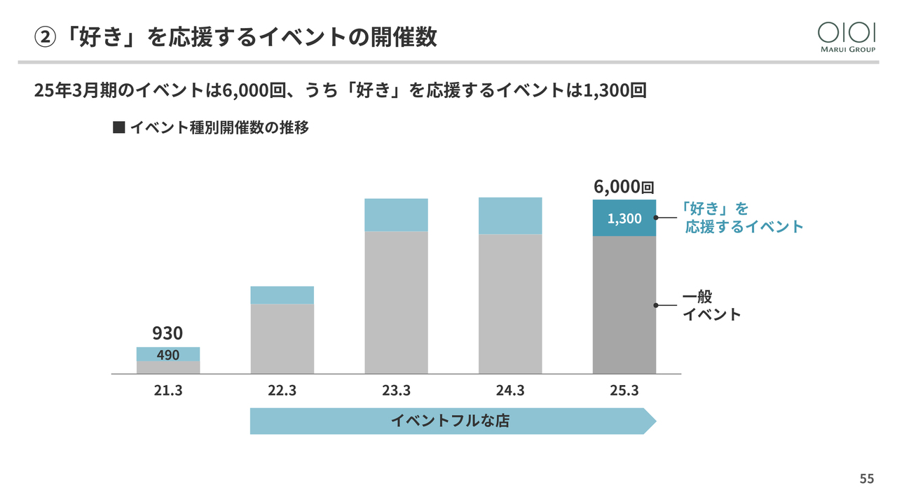 次に、「好き」を応援するイベントについてです。イベントフルな店舗作りを進めた結果、直近3年間でイベント開催数は年間約6,000回と急拡大しました。そのうち、「好き」を応援するイベントは1,300回で、全体の2割強を占めています。