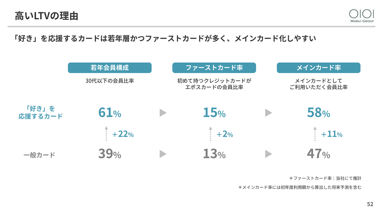 次に、「好き」を通じたメインカード化です。先ほど、「『好き』を応援するカード」はファーストカードが多いことから、LTVが高いとご説明しました。