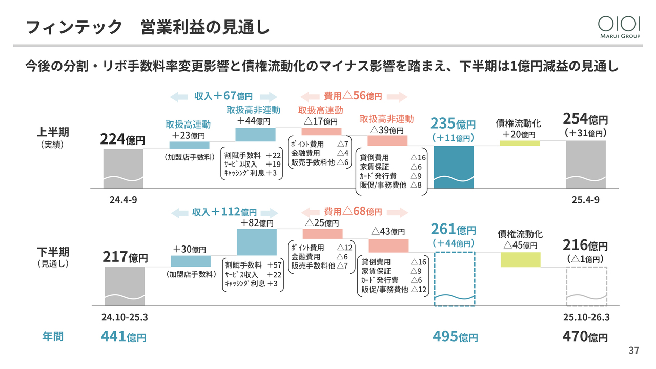 フィンテックの下半期の見通しです。営業利益は、分割リボ手数料率の変更影響と債権流動化のマイナス影響を踏まえ、年間見通しは年初計画どおり470億円を見込んでいます。