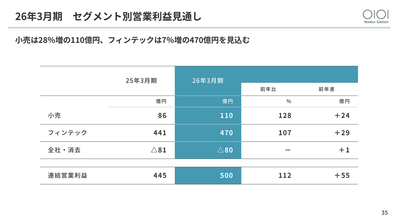 セグメント別の営業利益です。小売は前年同期比28パーセント増の110億円、フィンテックは7パーセント増の470億円と、こちらも期初計画から変更はありません。