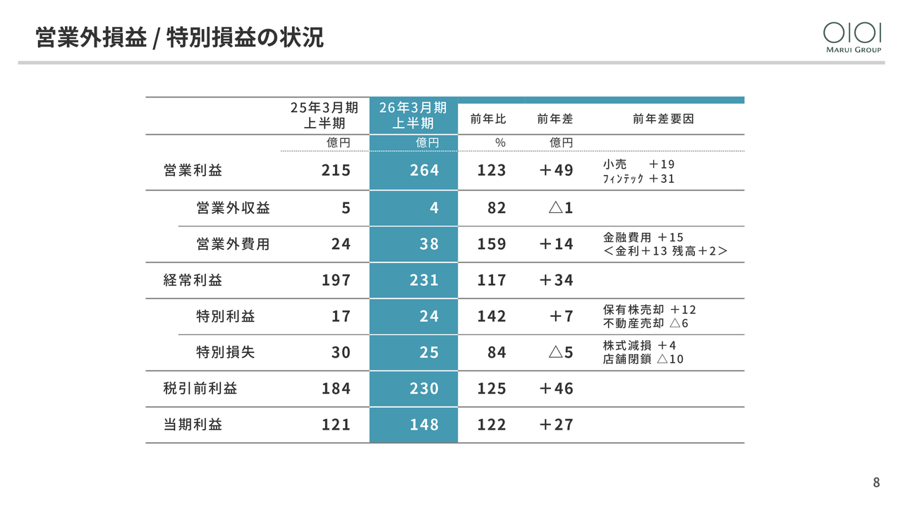 特別損益については、政策保有株の売却益や、前年に店舗の減損損失があったことなどが利益増加要因となり、当期利益は22パーセント増の148億円となりました。