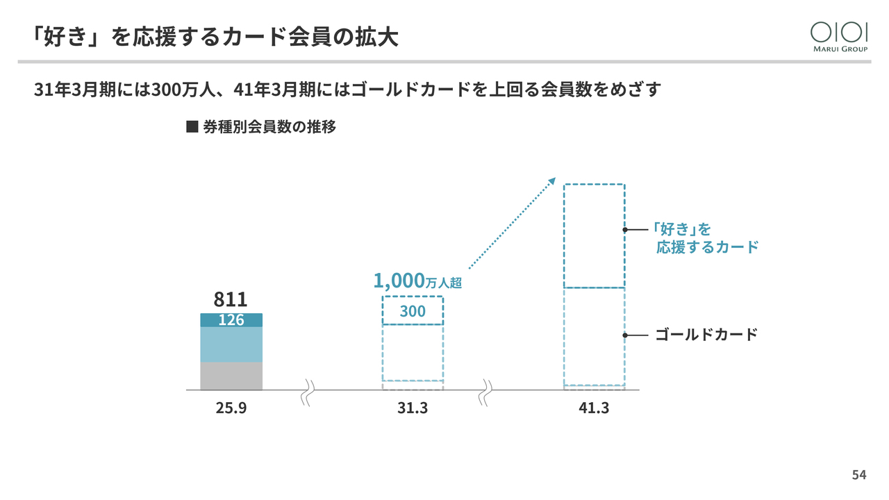 「『好き』を応援するカード」の会員数は、2031年3月期には300万人、2041年3月期にはゴールドカード会員を上回る規模を目指します。