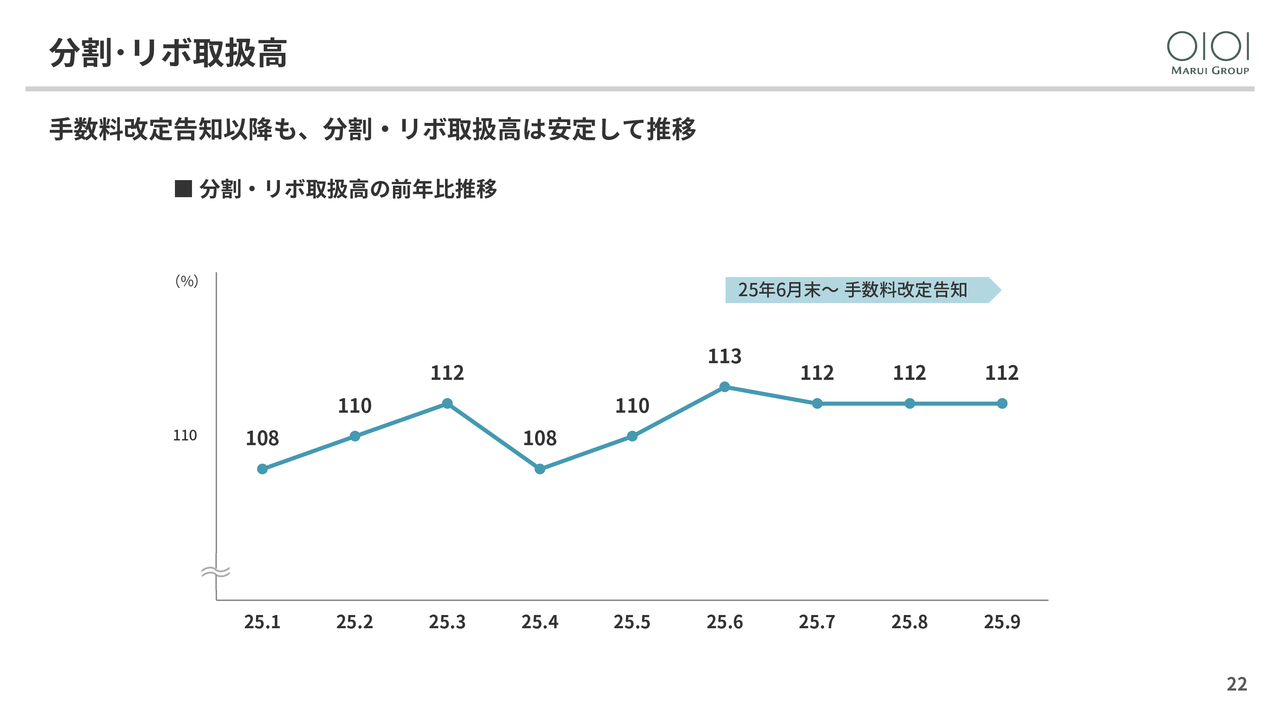 分割・リボ取扱高の前年比推移です。6月末の手数料改定告知以降も、分割・リボ取扱高は安定して推移しており、今後の手数料収入は想定どおりの拡大が見込まれます。