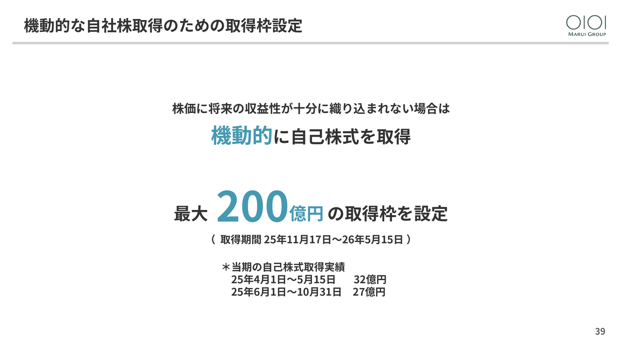 最後に、株価に将来の収益性が十分に織り込まれない場合には、機動的に自社株取得を行うため、上半期に続いて下半期も最大200億円の自社株取得枠を設けます。私からは以上です。