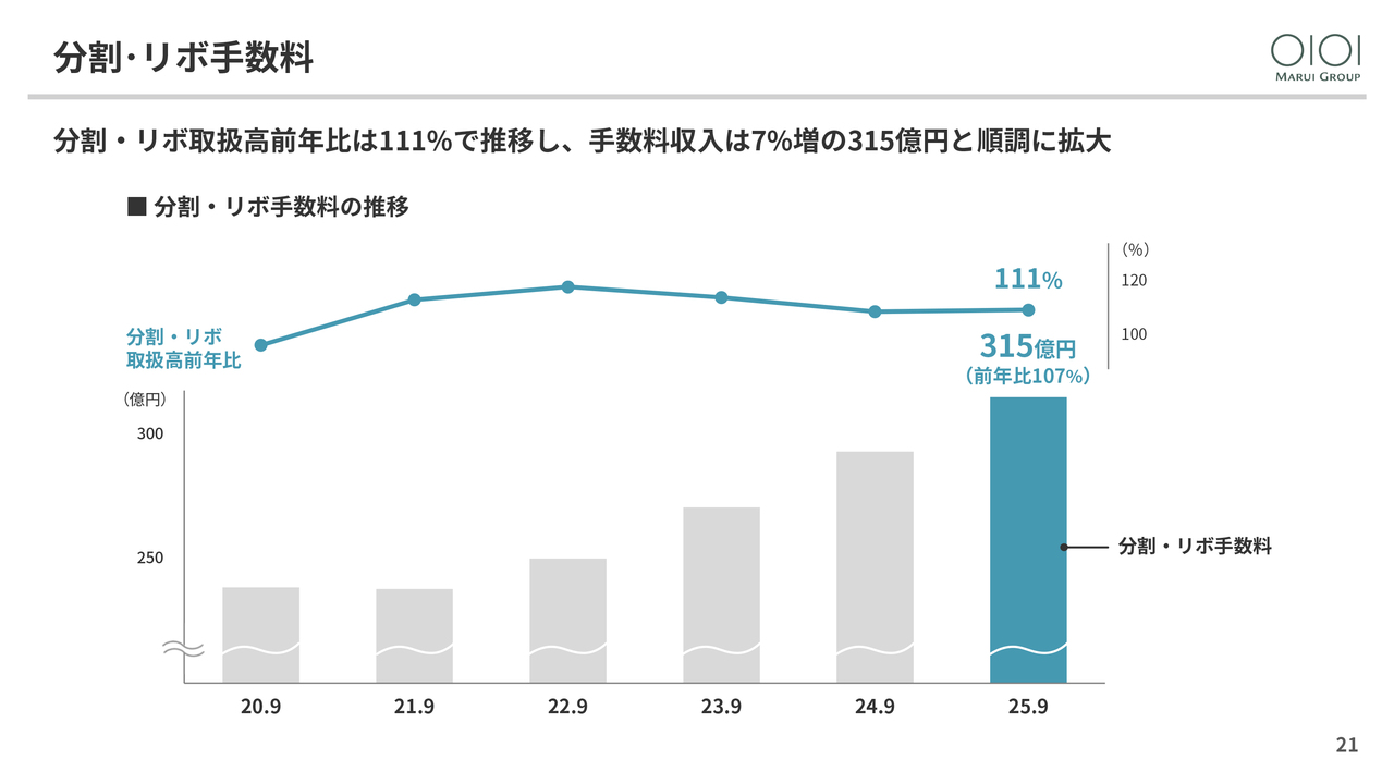 分割・リボ手数料の推移です。上半期の分割リボ取扱高は前年比111パーセントで推移し、手数料収入は7パーセント増の315億円と順調に拡大しました。