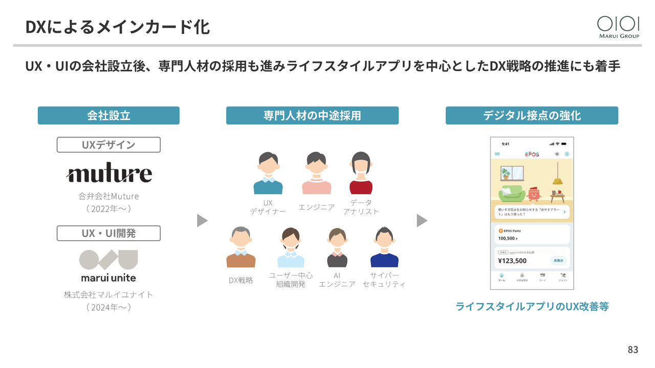 あわせて、DXによるメインカード化も進めます。2022年にグッドパッチと合弁で設立したUXデザインのMutureや、2024年に設立したUI・UX開発のマルイユナイトを通じて優秀な専門人材の採用が進み、お客さまとのデジタル接点であるライフスタイルアプリの改善に着手できるようになりました。