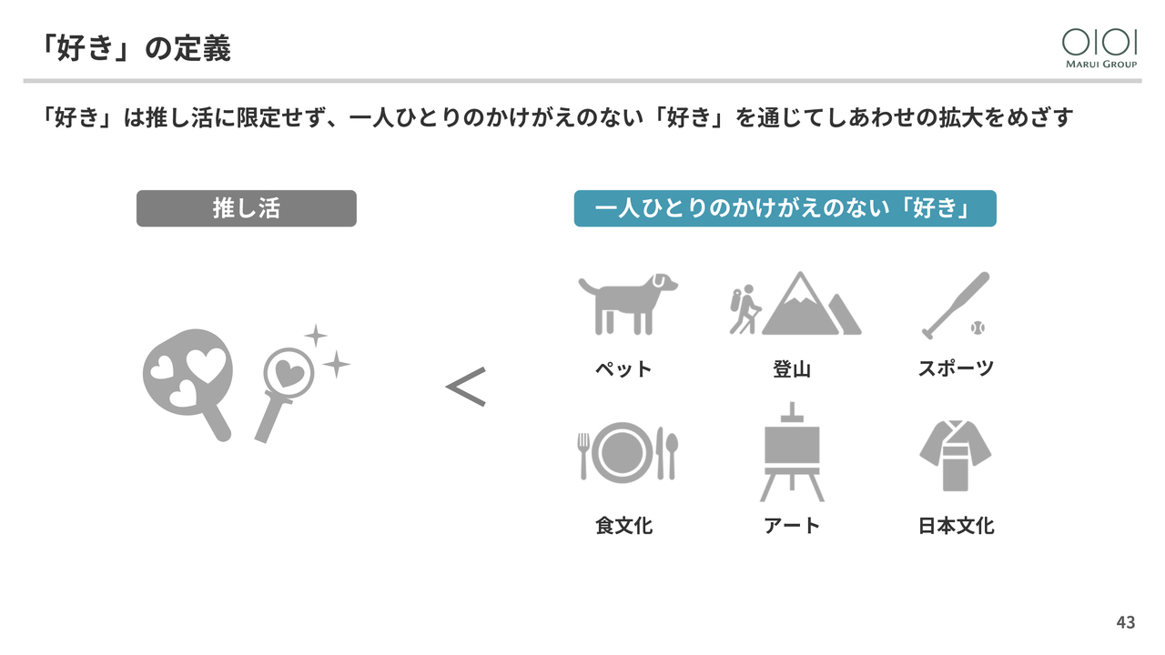 私たちの「好き」の定義は、いわゆる推し活ではありません。私たちが応援する「好き」は推し活にとどまらず、ペットや登山、スポーツ、食文化、アート、日本文化など、一人ひとりにとってかけがえのない「好き」、多様な「好き」を包摂する概念です。