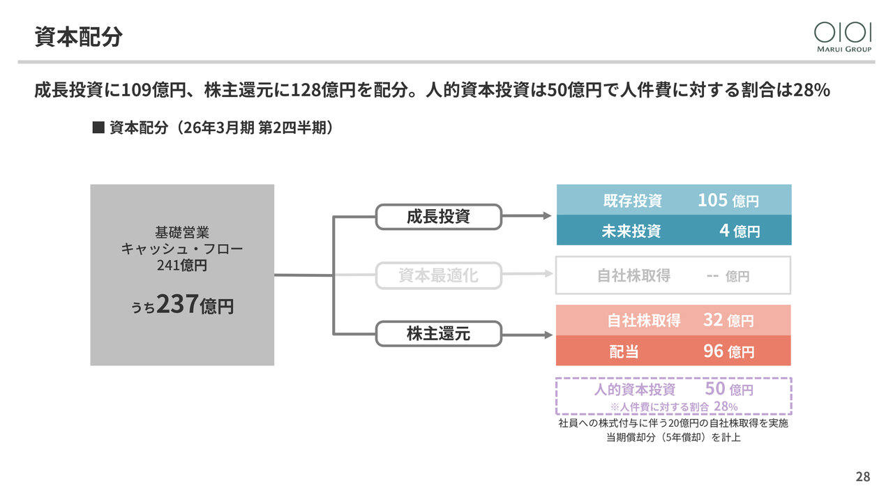 資本配分です。基礎営業キャッシュ・フロー241億円のうち、237億円を成長投資と株主還元に配分しました。内訳は、成長投資109億円、自社株取得32億円、配当96億円となっています。人的資本投資は50億円で、人件費に占める割合は28パーセントとなりました。