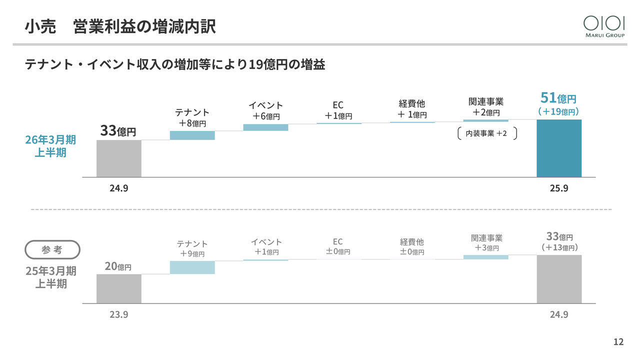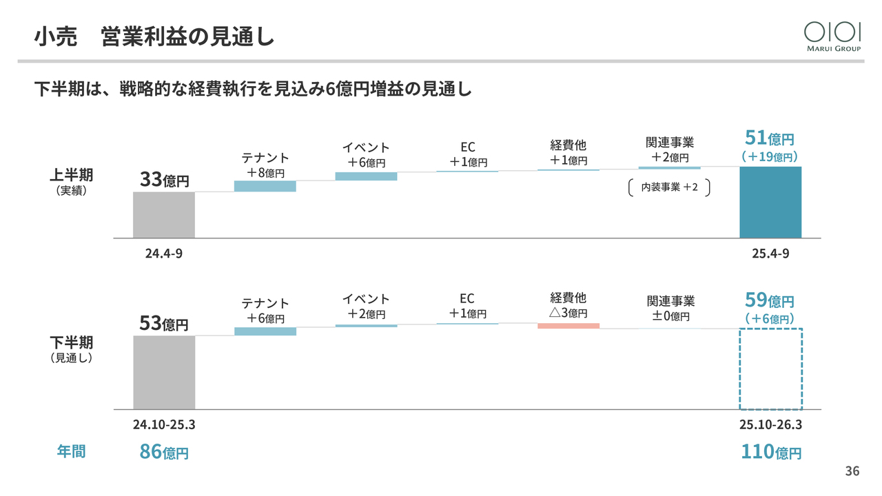 質問者:今期の各事業の見通しについて、まず小売事業に関して、第1四半期の時点でお出しになった小売事業の営業利益のウォーターフォールチャートと今回の見立てを比較すると、テナント・イベントともに営業利益の増益額自体が上振れているかと思います。例えば、第1四半期の時点で出されていたテナントの年間利益は11億円の増益とされていましたが、今回の見立てでは14億円となっています。