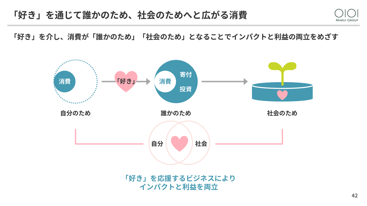 「好き」を応援するビジネスの目的は、「好き」を通じて自分のための消費が「誰かのため」「社会のため」へと広がることで、インパクトと利益の両立を実現することにあります。