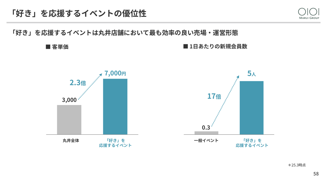 「好き」を応援するイベントの客単価は店舗平均の約2.3倍と高く、1日当たりの新規会員数も一般イベントと比べて17倍と、マルイ店舗において最も効率の良い売場となっています。
