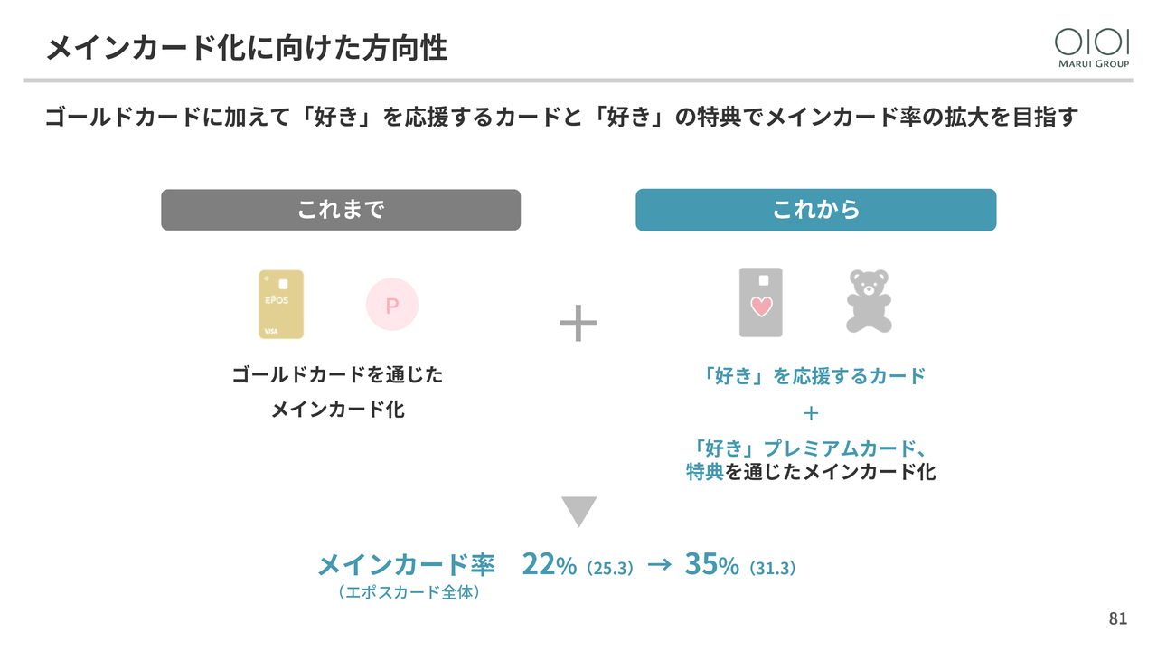 現在、「エポスカード」全体のメインカード率は22パーセントですが、施策を通じて2031年3月期には35パーセントまで高めていきます。
