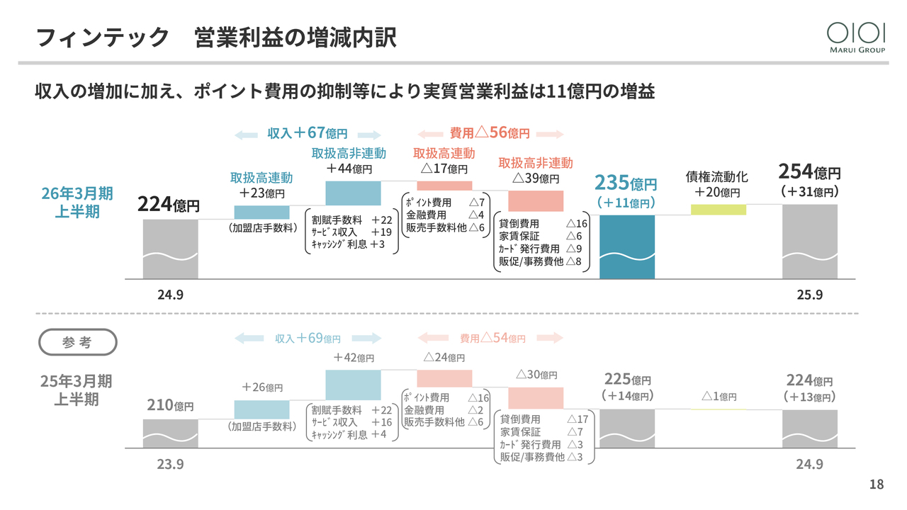 次にフィンテックの状況です。営業利益増減の内訳として、債権流動化を除く実質営業利益は、収入の増加やポイント費用の抑制などにより、11億円の増益となりました。また、下半期から分割リボ手数料率の引き上げに伴い、債権流動化を前倒しで行ったこともあり、セグメント利益は31億円増加しました。
