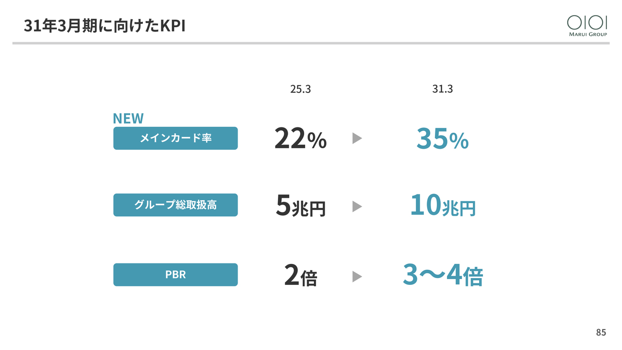 最後に、以上を踏まえたKPIについてです。2031年3月期に向けて、メインカード率を35パーセントまで高め、グループ総取扱高10兆円とPBRを3倍から4倍にすることを目指します。