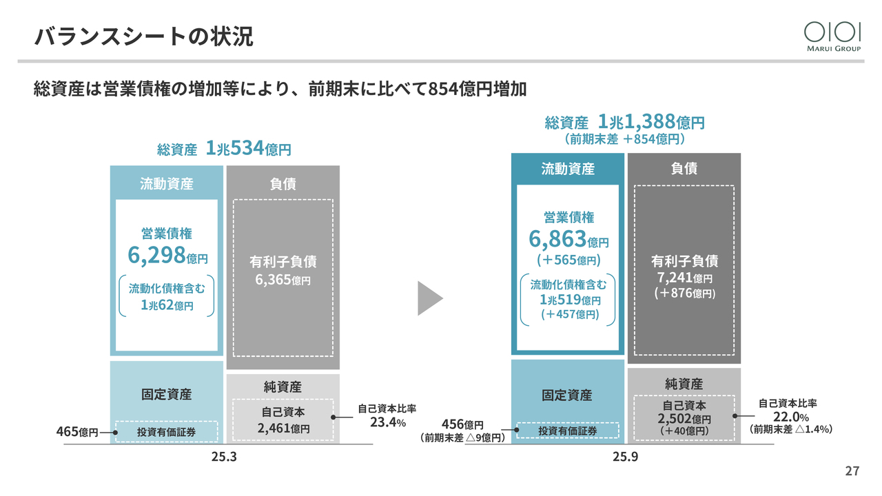続いて、バランスシートと資本配分についてです。バランスシートの状況についてご説明します。総資産は営業債権の増加などにより、前期末比で854億円増加し、1兆1,388億円となりました。自己資本比率は前期末比で1.4ポイント減少し、22パーセントとなりました。