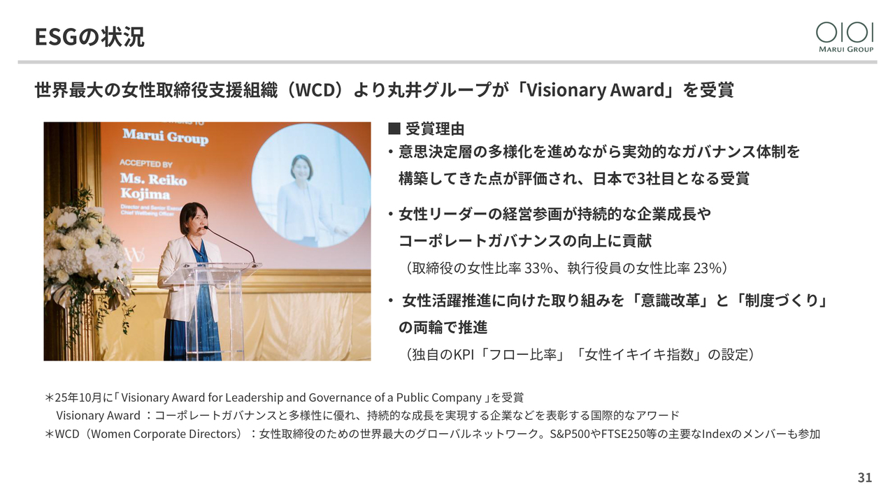 ESGの状況です。2025年10月に、世界最大の女性取締役支援組織(WCD)より、日本では3社目となる「Visionary Award」を受賞しました。意識改革と制度作りによって、意思決定層の多様化を推進し、実効的なガバナンス体制を構築してきた点が評価されています。