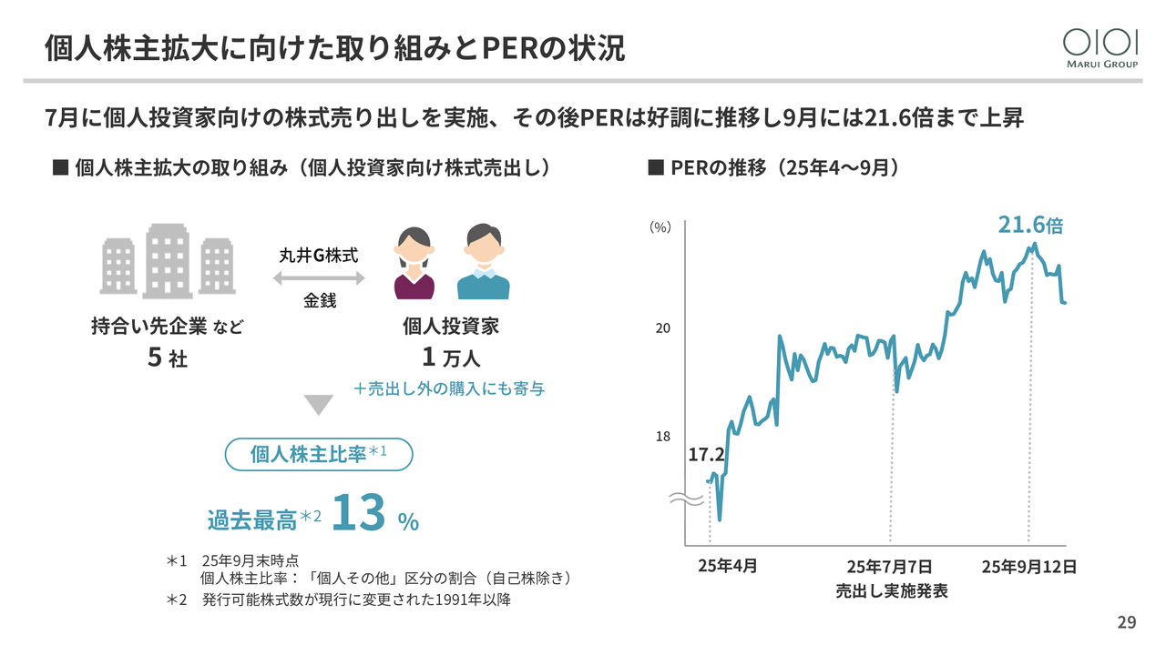 売り出しをきっかけに、その後も購入していただいた事例があり、9月末時点の個人株主比率は過去最高の13パーセントとなりました。PERについても、売り出し後は好調に推移し、直近9月には21.6倍まで上昇しました。