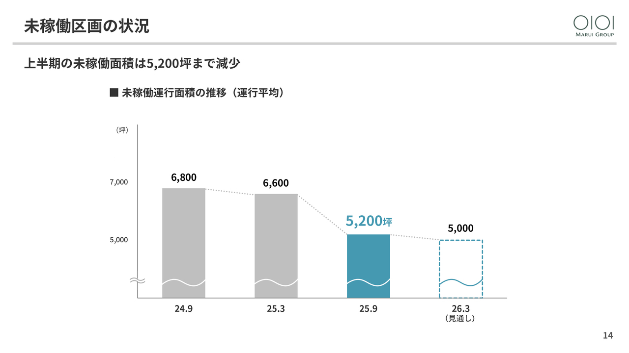 未稼働区画の状況です。未稼働面積は前年の6,800坪から5,200坪まで減少しました。