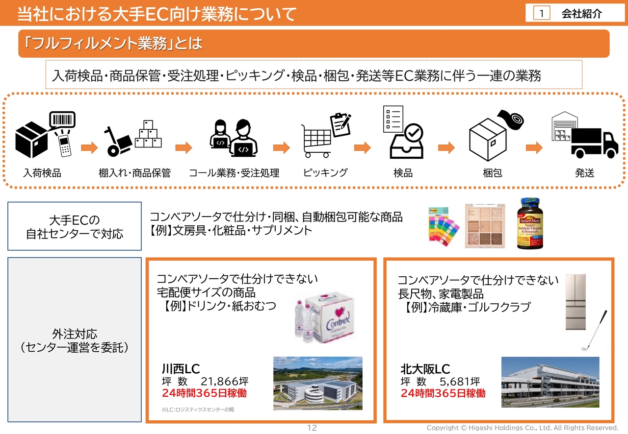 児島:主な取引先である大手EC企業と当社の業務関係についてご紹介します。当社は2019年より、大手ECセンターの運営を受託しています。大手EC企業の自社センターでは取り扱いが難しい飲料商品の取り扱いを皮切りに、2020年からはゴルフクラブなどの長尺物や家電製品といった大型商品の取り扱いも開始しました。