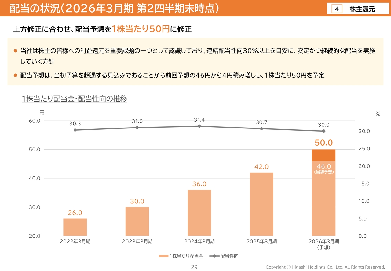 2026年3月期については、期末配当予想を1株46円としていましたが、今回の業績予想の上方修正に伴い、当初予想からさらに4円を上乗せし、前回配当から8円増の1株50円とする予定です。