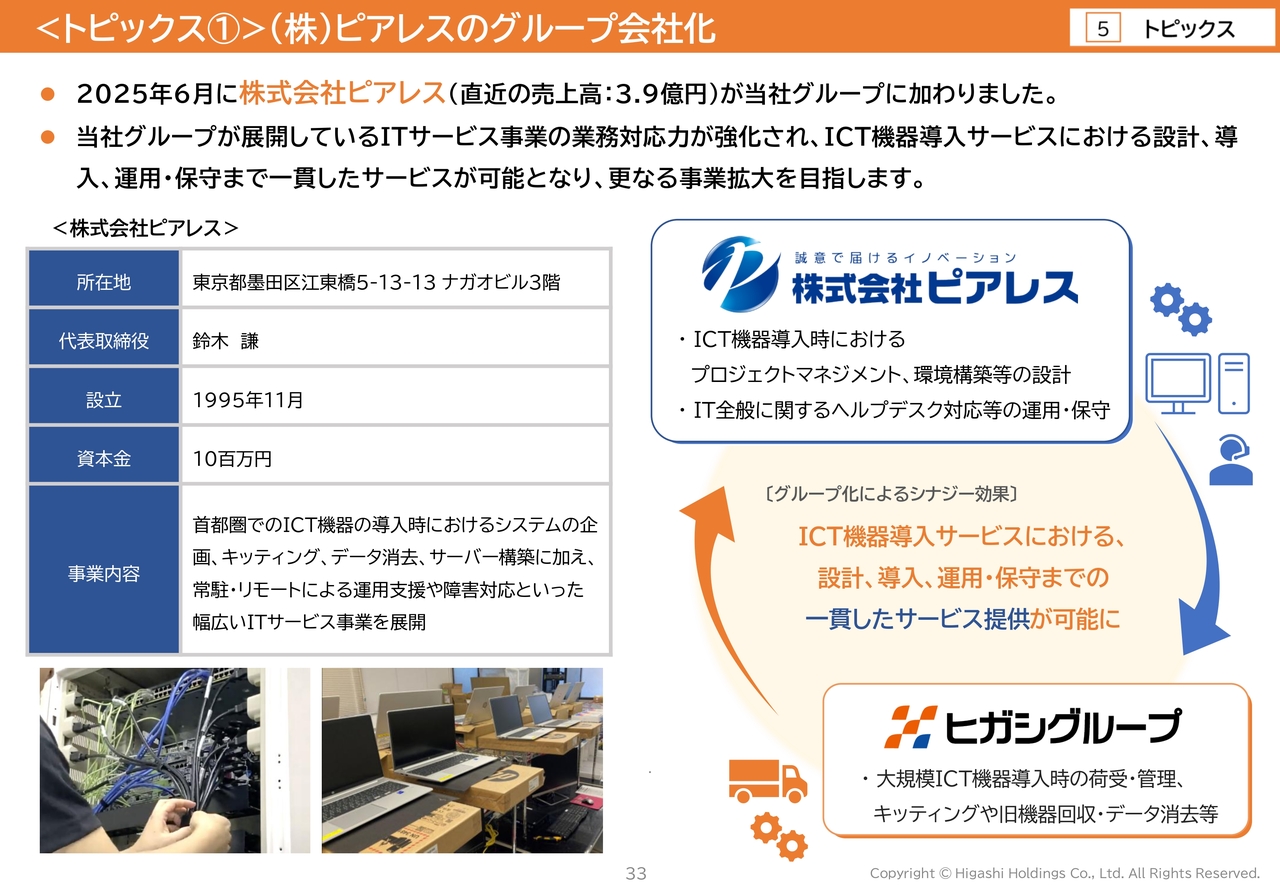 児島:直近のトピックスをご紹介します。まずは、株式会社ピアレスのグループ会社化についてです。2025年6月に、首都圏でのICT機器導入時のサポート、常駐およびリモートによる運用支援や障害対応など、幅広いITサービス事業を展開している株式会社ピアレスが、当社グループに加わりました。