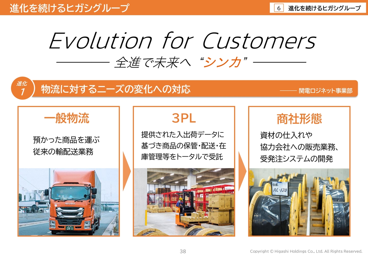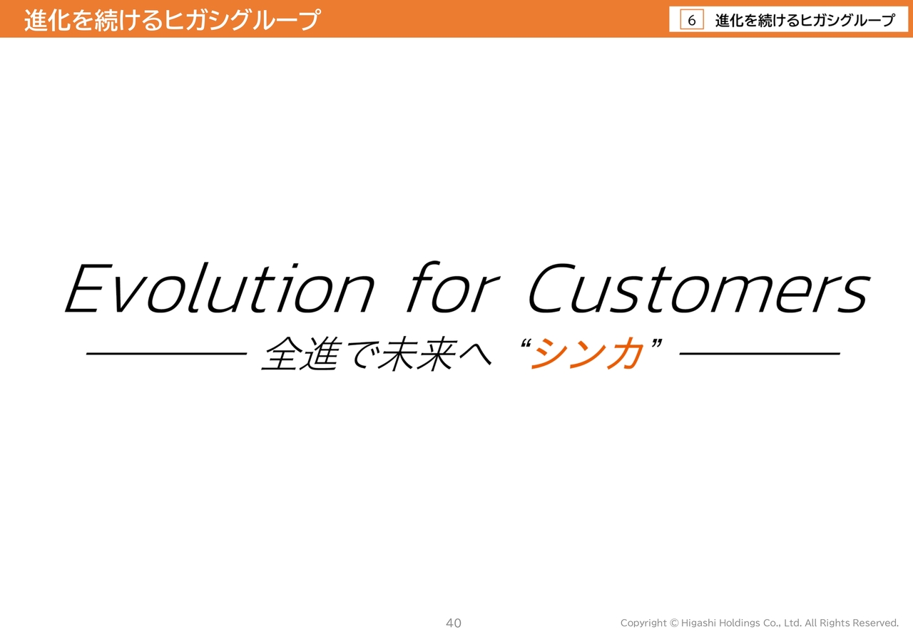 当社グループは創業80年以上の長い歴史を持ちます。しかし私は、「老舗企業です」と自慢したいのではありません。ヒガシはお客さまの変化に合わせて80年以上にわたり、“シンカ”し続けてきた企業です。そして今後も“シンカ”を続け、お客さまの成長や社会の成長を担っていきたいと考えています。