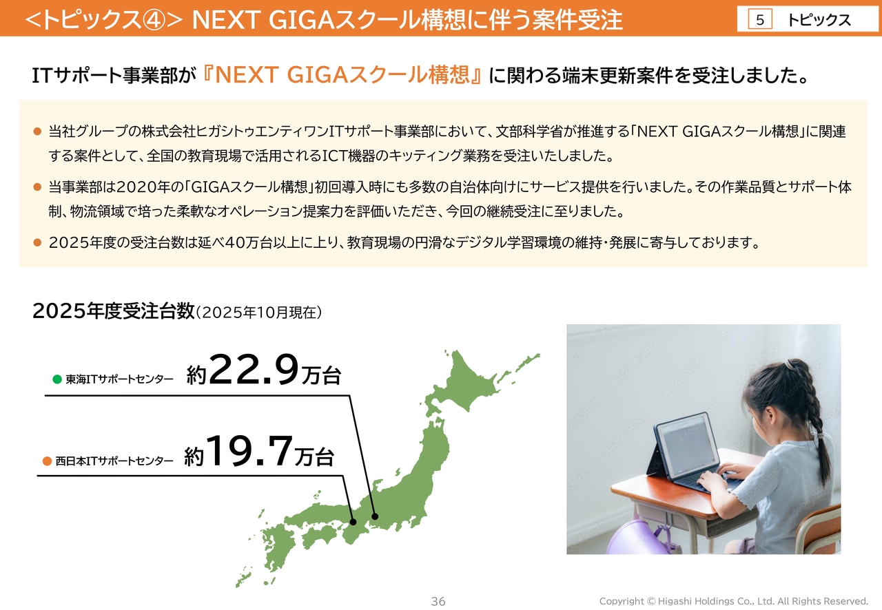 児島:ITサポート事業部の受注案件についてご紹介します。当社グループの株式会社ヒガシトゥエンティワンITサポート事業部では、文部科学省が推進する「NEXT GIGAスクール構想」に関連する端末更新案件を受注しています。