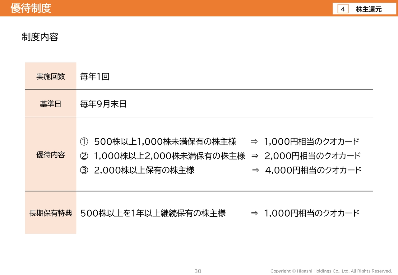 児島:優待制度として、毎年1回、9月末日を基準日とし、スライドに記載のとおり、保有株数に応じて「QUOカード」をお渡ししています。また、長期保有特典として、500株以上を1年以上保有している方には1,000円相当の「QUOカード」をお渡ししています。