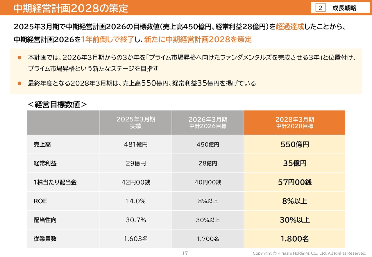 本計画では、今期からの3年間をプライム市場昇格に向けたファンダメンタルズを完成させる期間と位置づけ、さらなる取り組みを進めていきます。経営目標数値としては、2028年3月期で売上高550億円、経常利益35億円を掲げています。