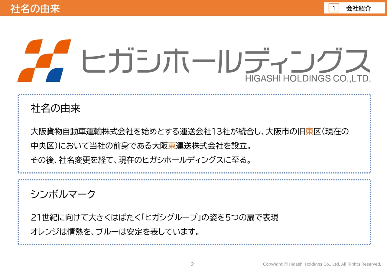 児島:本日は6つのテーマを用意していますが、初めに、ご質問をいただく機会の多い社名の由来についてお話しします。当社は、戦時中の鉄道省による運送統制を受け、1944年に大阪市の旧東区において運送会社13社を統合し、大阪東運送株式会社として事業をスタートしました。