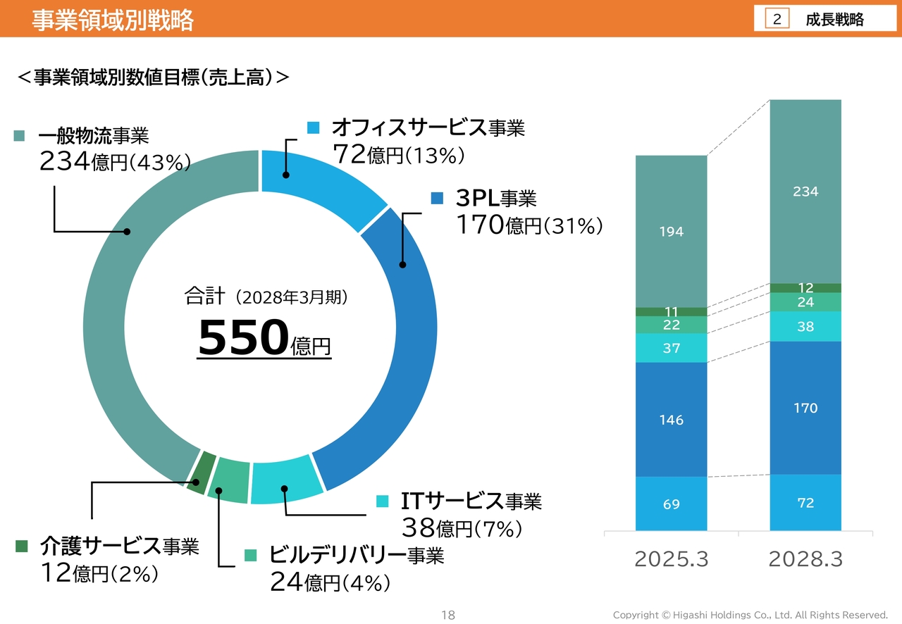 各事業領域の目標は円グラフに記載のとおりです。全領域で2025年3月期からプラス成長を目標としており、特に3PL事業と一般物流事業では、大幅な成長を見込んでいます。