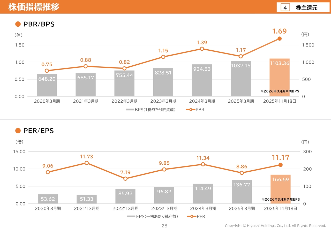2025年3月期の実績PERは8.86倍と下落傾向にありますが、先ほどのスライドにあったとおり、11月18日時点での予想PERは11.17倍となり、業績成長に伴い、株価上昇が追いついてきている状況です。