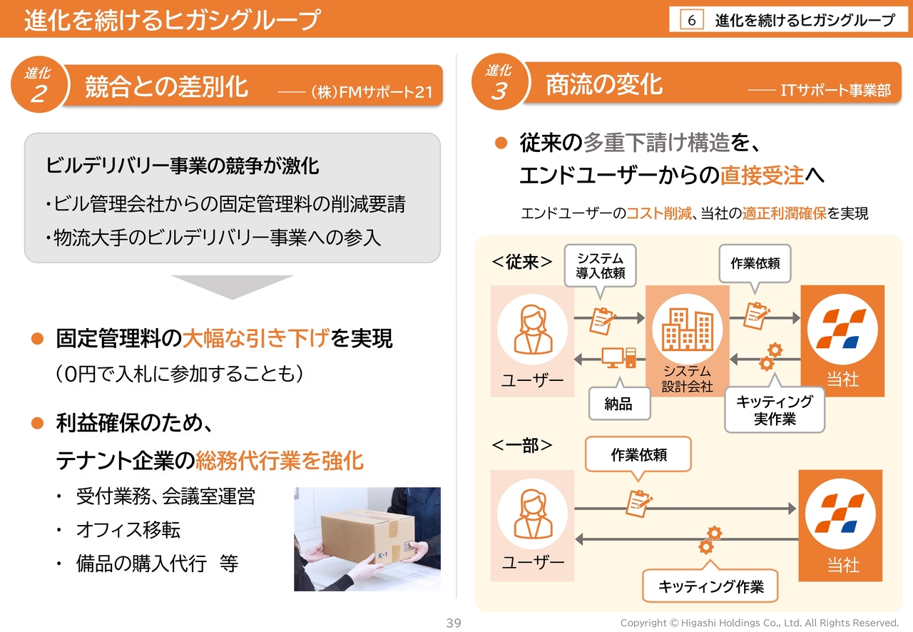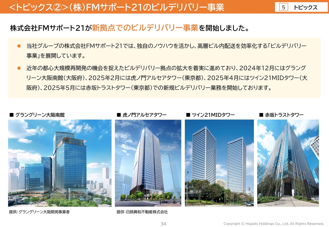 そのため、特定の事業に依存せず、すべての事業領域を成長ドライバーとして位置づけています。ただし、例えばオフィスサービス事業やビルデリバリー事業は、近年首都圏での大型ビル開発が継続していることもあり、新規顧客の獲得に大きく成功しています。結果として、これらの事業では高い成長力を維持しています。