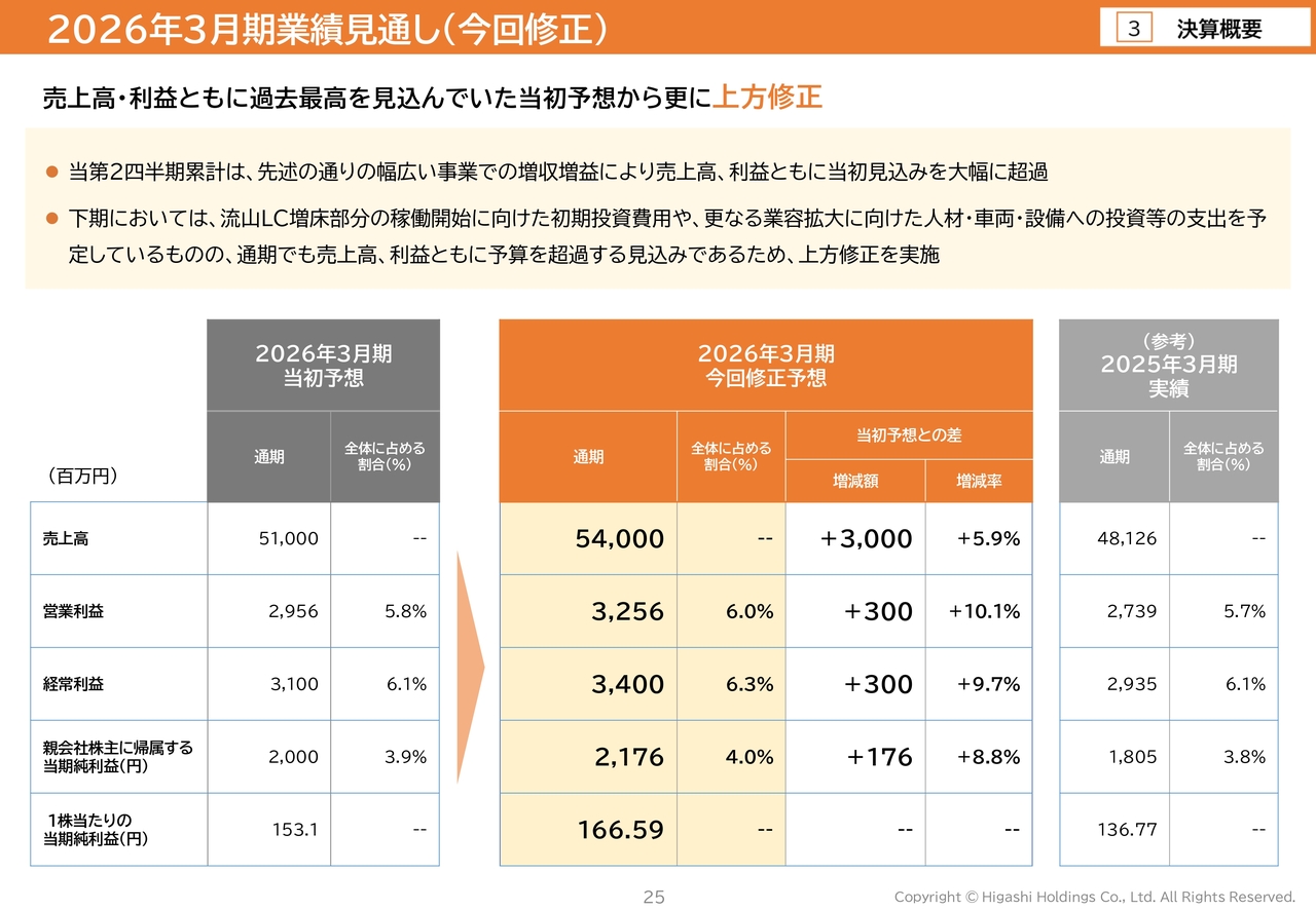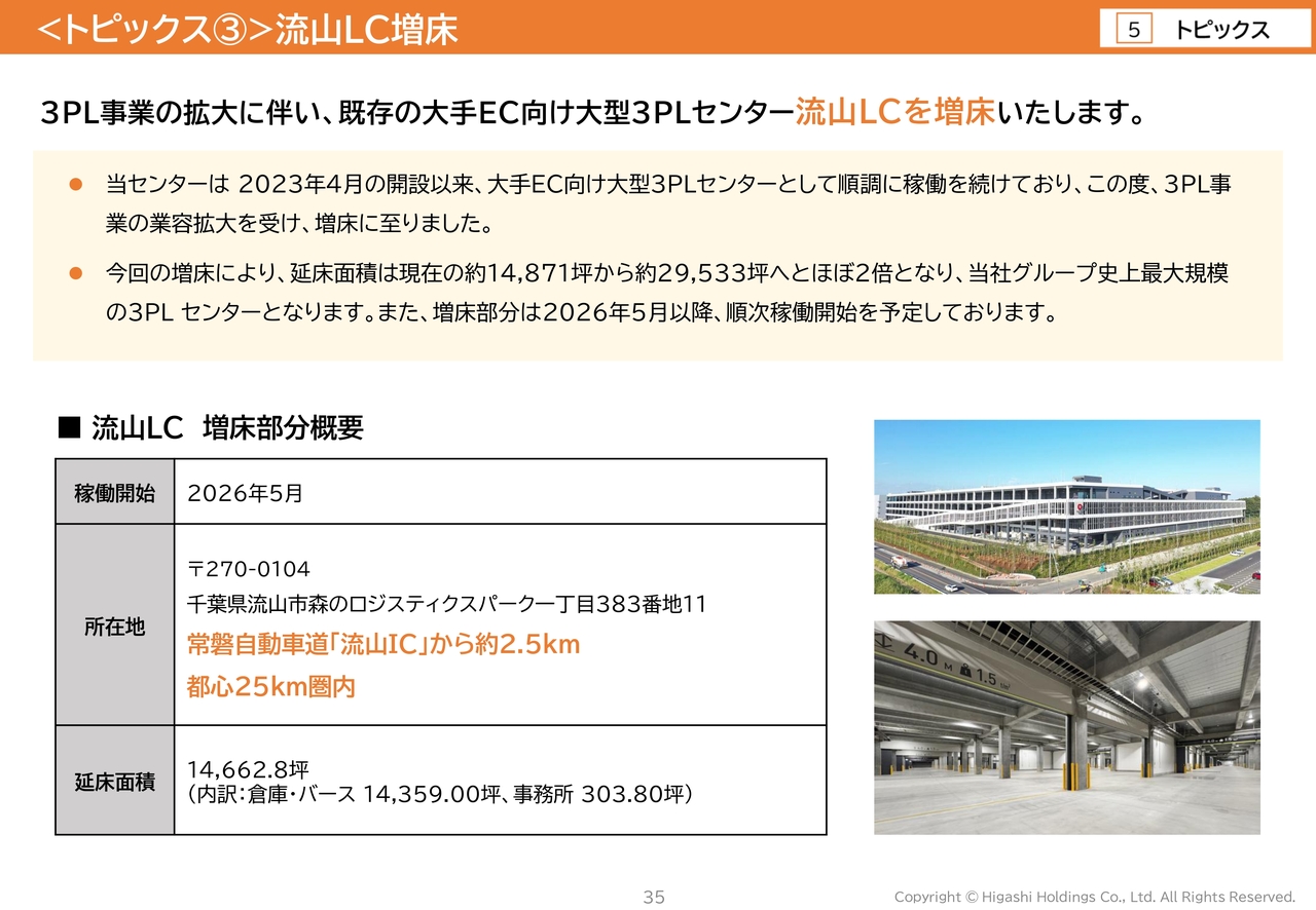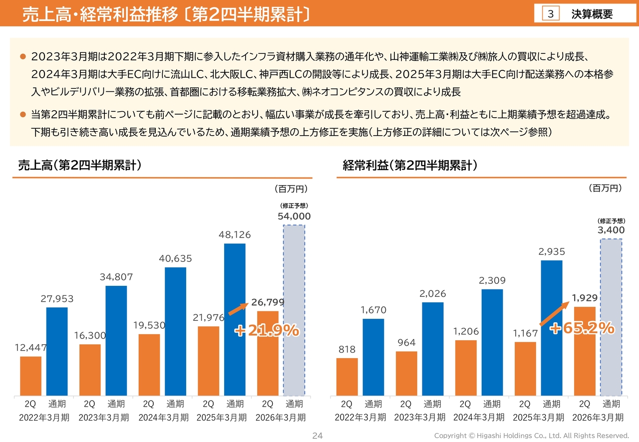下期では、後ほどご紹介する、流山ロジスティクスセンターの増床部分の稼働開始に向けた初期投資費用や、幅広い事業のさらなる業容拡大に向けた人材・車両・設備への投資などの支出が予定されていますが、通期でも売上高、利益ともに当初予算を超過する見通しです。